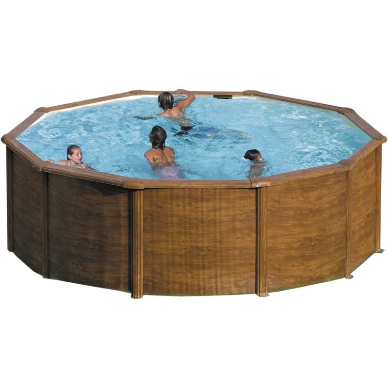 PISCINE CIRCULAIRE EN ACIER ASPECT BOIS GRE SICILIA KITPROV353W Parfaite pour le jardin ou la terrasse Description : - Dimensions : 120 cm de hauteur - Capacité :approximative 10.102 litres - Espace nécessaire pour montage 400 x 400 cm (longueur x largeur) - Structure en acier galvanisé, phosphaté et revêtement en bois - Orifice pour buse de refoulement et skimmer Inclus : - Liner PVC couleur bleu 30/100 système Overlap avec traitement anti-ultraviolet - Épurateur à sable qui permet de filtrer 3.8 m3/heure - Échelle de sécurité - Garantie + soutien technique (par GRE)