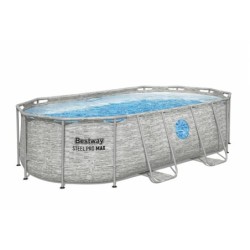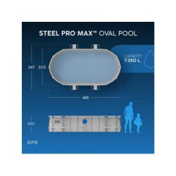 Renouvelez et embellissez votre jardin en installant cette nouvelle piscine hors sol Steel Pro Max Splashview Oval de 427 x 250 x 100 cm de Bestway. Il s'agit d'une piscine hors sol de grande taille, au design moderne très réussi, qui offre d'innombrables avantages, tels que ses fenêtres immergées innovantes, son système de connexion simple et sûr, et bien d'autres surprises. Tout ce dont vous avez besoin pour profiter de votre piscine dès le premier jour est inclus. Il vous suffit de trouver l'endroit idéal pour l'installer, de la remplir d'eau, de connecter les accessoires et de profiter de cet espace magique dédié au jeu, à la détente et à la fraîcheur. Le pack comprend : + Piscine démontable Steel Pro Max Splashview de forme ovale, valve de vidange, connecteurs T-Connector, fenêtres intérieures et autres détails de luxe. + Filtre à cartouche, débit de 2 006 l/h (réf. 58383), raccords de 32 mm et tension de 220-240 50 Hz. + Cartouche filtrante de type II (réf. 58094). + Échelle (réf. 58330). + Couverture de couleur noire. + Liner Tritech très résistant avec extérieur de couleur grise avec effet spécial dans le design et intérieur de couleur bleue et blanche avec effet de pierres prismatiques dans son design. Informations utiles sur la piscine : + Dimensions approximatives de la piscine : 100 cm de haut x 250 cm de large x 427 cm de long. + Espace total approximatif occupé par la piscine montée : 100 cm de haut x 290 cm de large x 427 cm de long. + Capacité approximative en eau lorsque la piscine est remplie à 90 % : 7 250 litres. + Âge recommandé pour l'utiliser : à partir de 6 ans. + Poids approximatif de la piscine sans eau : 55,26 kg. + Aucun outil n'est nécessaire pour le montage. Temps estimé pour le montage par trois adultes : 30 minutes.