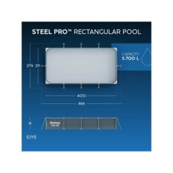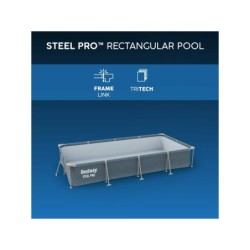 PISCINE TUBULAIRE RECTANGULAIRE BESTWAY ref.56424 400x211x81 cm Idéale pour jardin ou terrasse. Grande stabilité Description : - Capacité :approximative 5.700 litres - Dimensions : 400 x 211 x 81 cm (longueur x largeur x hauteur) Inclus : - Épurateur Réf. 58381 à cartouches Réf. 58093 qui permet de filtrer 1.249 litres/heure (inclus cartouches) - Liner Tritech, 3 liners en polyester polylaminé PVC résistants à la pression de l'eau et aux produits chimiques (traitement anti-ultraviolet )